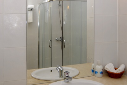 - Spacious bathroom with shower, WC, sink with marble surround, hairdryer